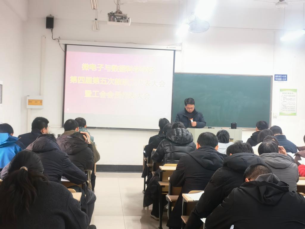 1月26日下午,微电子与数据科学学院第四届第五次教职工代表大会暨工会会员代表大会在数理楼303会议室隆重召开。学院56名教代会代表及列席代表利用假期参会,共商发展大计。大会由学院党委书记汪春胜主持,在庄严的国歌声中拉开帷幕。